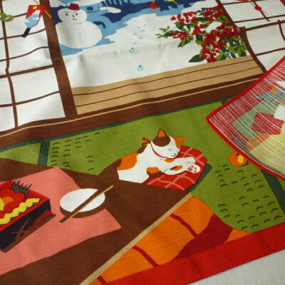 三毛猫みけの夢日記 小ふろしき〔みけの初夢〕1 日本製 綿100% 中巾 約50cm 日本の四季 歳時記 炬燵 御節 鏡餅 吊り飾り おしゃれ 和風タペストリー 冬 正月 年賀 ギフト